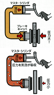ブレーキ・フルードが劣化したまま使用を続けると、ブレーキを多用したときにブレーキ・フルードが沸騰したような状態になり気泡が発生し、ブレーキ踏力が伝わりにくくなり、ブレーキの効きが悪くなります。
